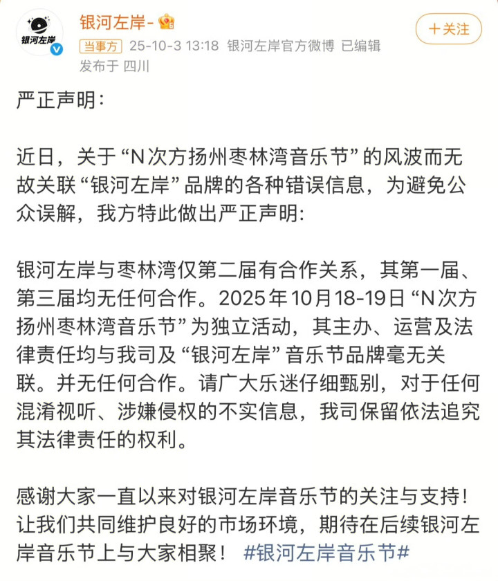 2025年10月初,银河左岸音乐节组委会的一纸声明撕开了演出行业光鲜表象下的暗流涌动。该声明直指网络流传的“梓渝演出费用200万元”说法为毫无根据的谣言,并宣布保留追究造谣者法律责任的权利。这一声明将音乐节推至舆论中心,也让公众开始关注音乐节行业繁华背后的混乱现状。
