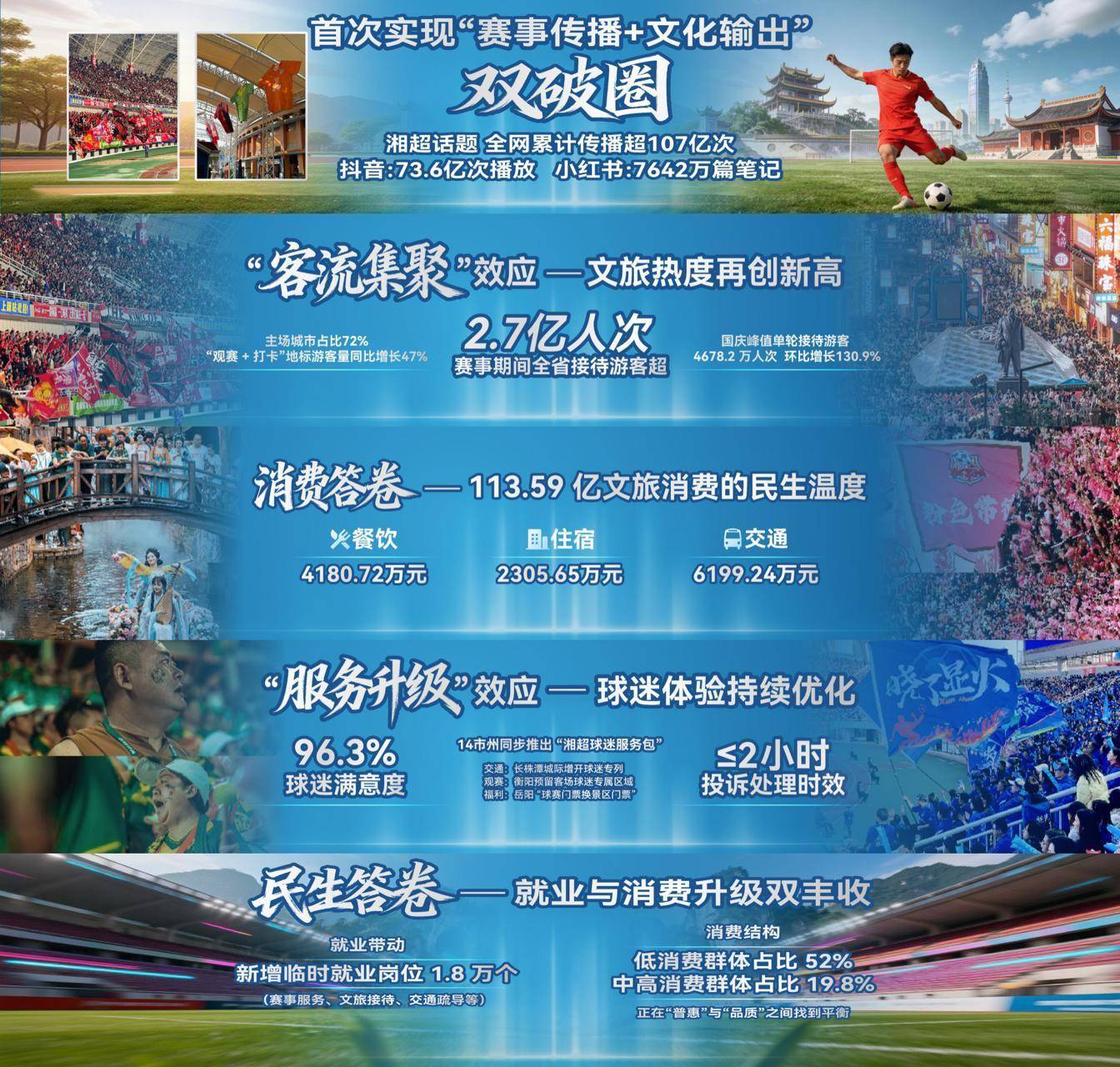 从秋日启幕到冬日欢聚,这场跨越季节、覆盖全省的创新实践,充分彰显了体育与文旅产业的乘数效应。展望未来,湖南将继续深挖“湘超”IP价值,推动体育、文化、旅游、商业在更广领域、更深层次、更高水平上协同共进,持续书写“因一场球,爱上一座城”的生动故事,为文旅产业高质量发展注入持久活力。